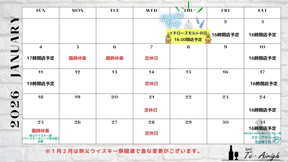 1月2月は秩父ウイスキー祭関連で急な変更もございます。